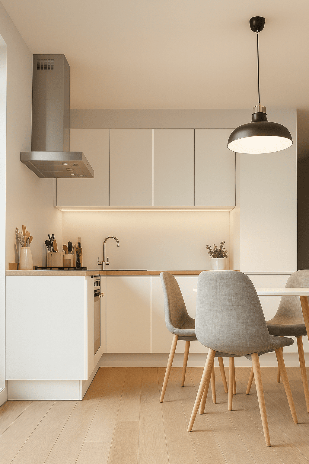 A minimalist interior where simplicity meets warmth. A bright, harmonious color palette based on beiges, off-whites, and natural wood tones creates a calm, welcoming space that supports everyday comfort. Subtle forms and carefully selected details highlight the modern character of the design without overwhelming it visually.
