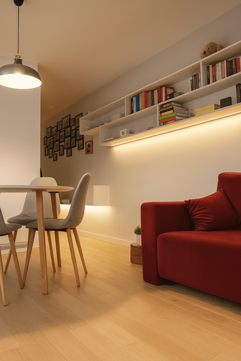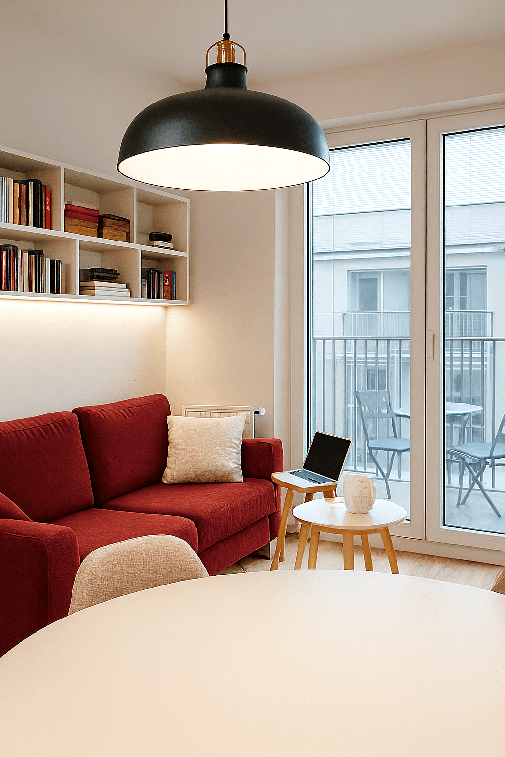Bold red accents introduce energy and depth, breaking up the muted palette and giving the interior a distinctive personality. They draw the eye and establish a unique rhythm within the space while maintaining an elegant balance.